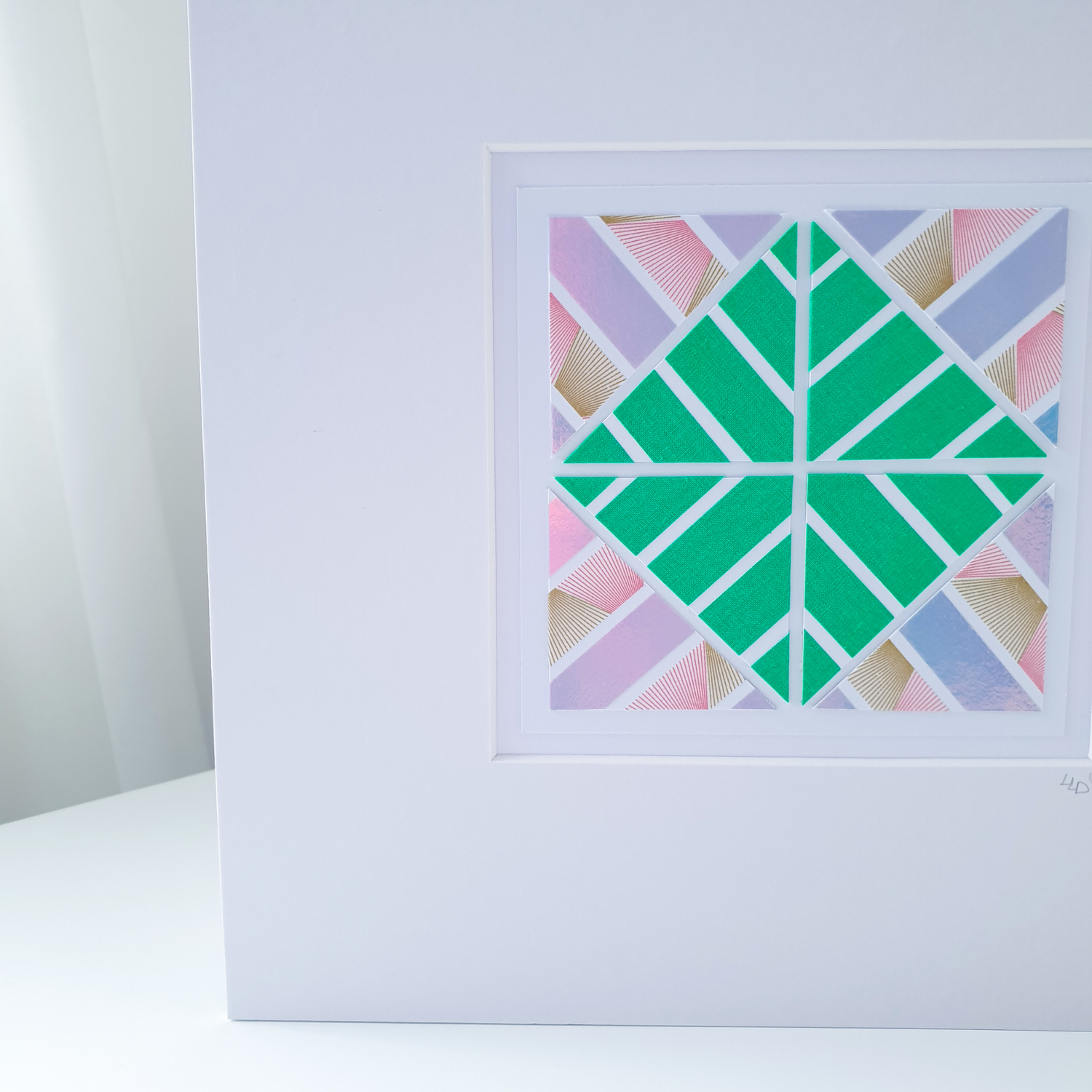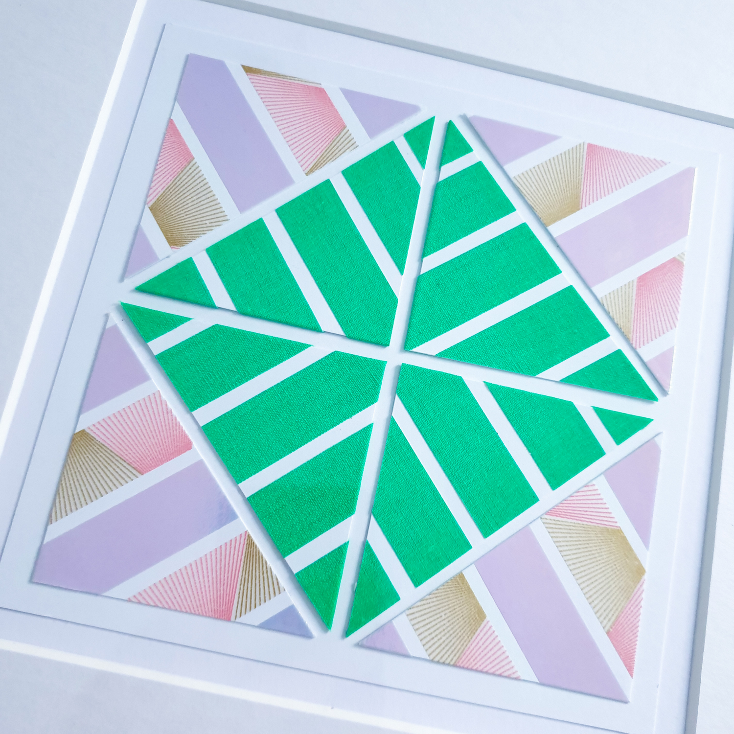 A contrasting mix of soft pastel pink gold art deco pattern and iridescent lilac holographic foil with bright neon green, applied to multi-layers of 300gsm card and hand cut to form an abstract botanical pattern.
